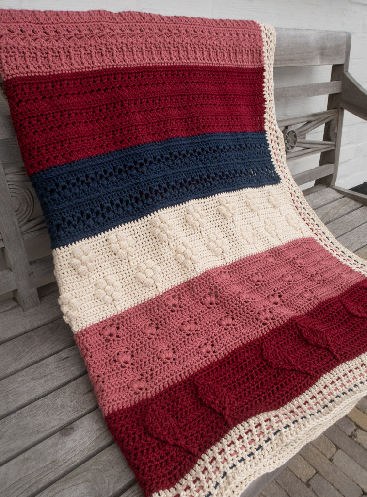 The blanket is made out of 12 different strip patterns that are worked on top of each other (no joining or sewing here!). A final border is then worked around the blanket.