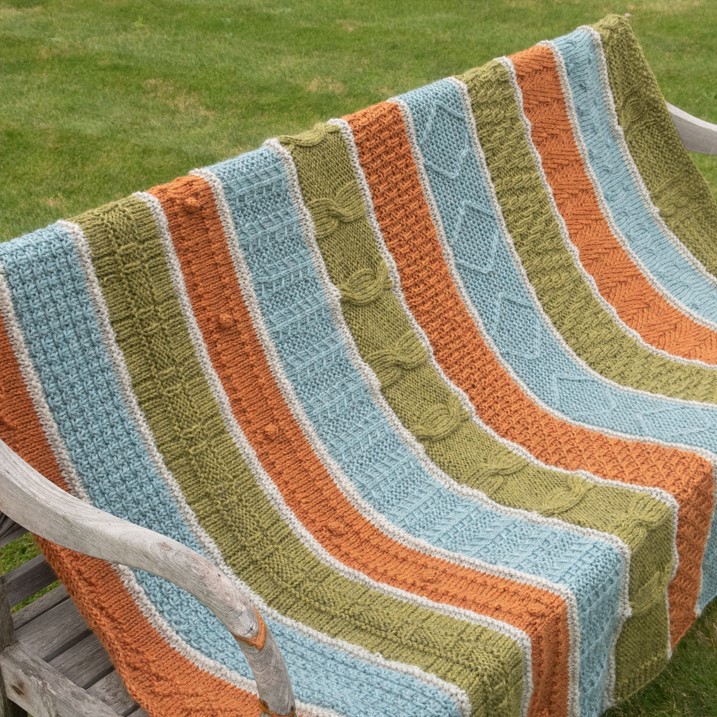 Balancing sophisticated knit and purl combinations with sections featuring 12 different knitting stitches, such as cables, bobbles, slipped stitches and more, the Falling into Stitches Blanket is designed intentionally to build up your skills and confidence from one section to the next.