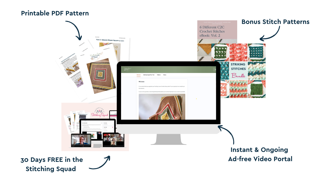 Bonus: 6 C2C Patterns Ebook - 6 textured crochet stitch patterns, so that while you’re diving into the Rustling Leaves Blanket, you’ve got matching, mindless rhythm stitches to unwind, experiment with, or switch to whenever you need a change of pace.