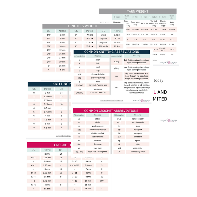 They includes hook & needle size conversions, abbreviations and more