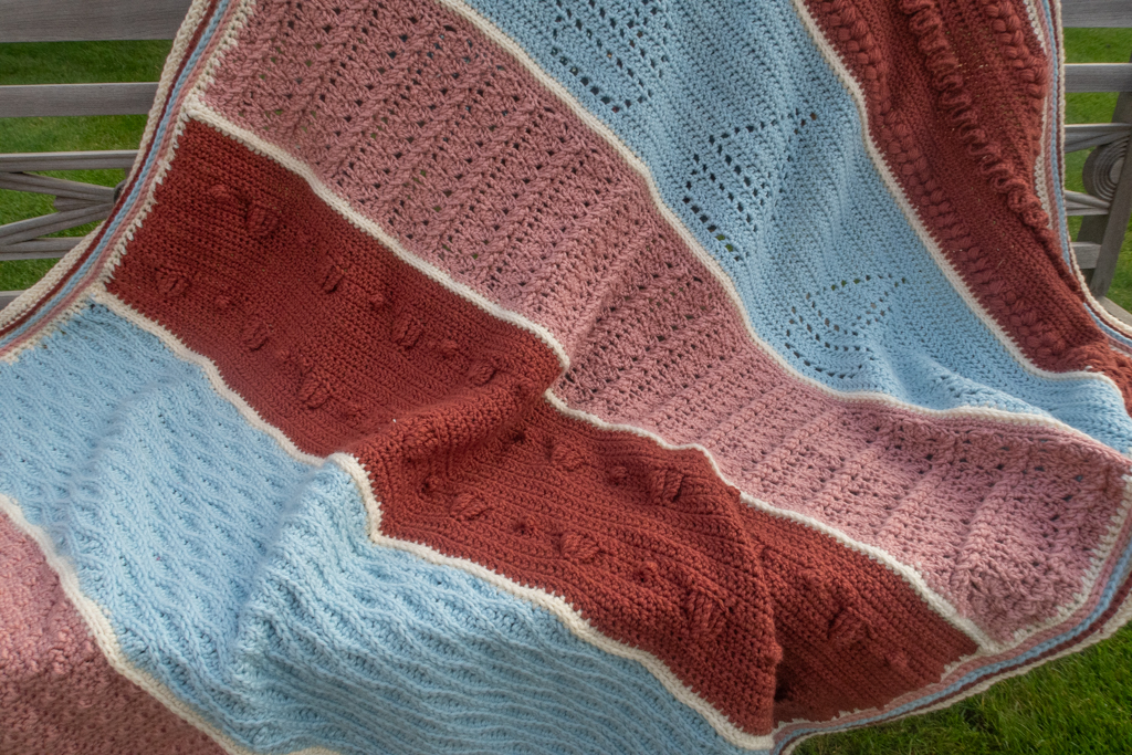 This is your opportunity to learn and practice 12 different crochet stitch combinations featuring bobbles, puff stitches, back & front post stitches and more while crafting a beautiful spring blanket!