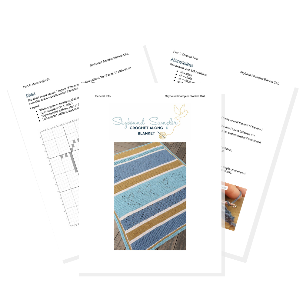 Building up your skills from simple stitch combinations to more sophisticated textures with sections featuring 8 different crochet stitches and techniques, such as post stitches, filet crochet, fans and more, the Skybound Sampler Blanket is designed intentionally to build up your skills and confidence from one section to the next.