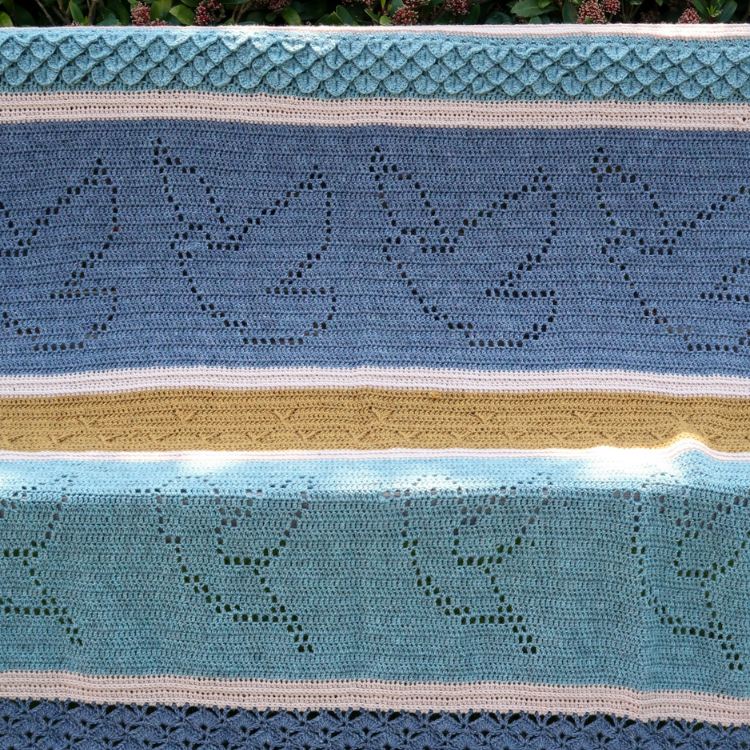 The blanket is made out of 8 different strip patterns worked on top of eachother (no joining or sewing here!) and the border is then worked around the blanket.