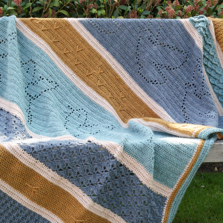 Building up your skills from simple stitch combinations to more sophisticated textures with sections featuring 8 different crochet stitches and techniques, such as post stitches, filet crochet, fans and more, the Skybound Sampler Blanket is designed intentionally to build up your skills and confidence from one section to the next.