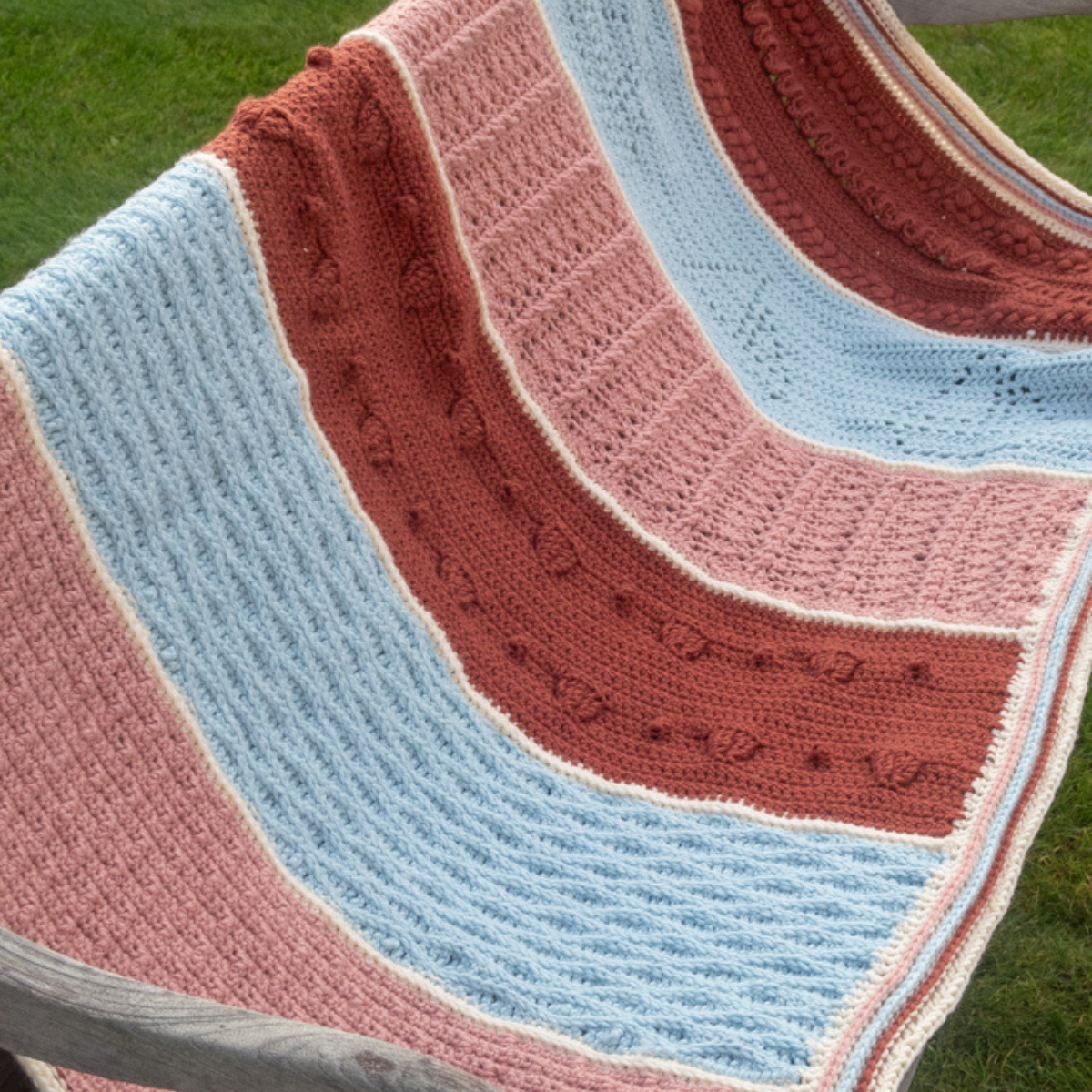 Building up your skills from simple stitch combinations to more sophisticated textures with sections featuring 7 different crochet stitches and techniques, such as shells, bobbles, filer crochet, slipped stitches and more, the Tidal Textures Throw is designed intentionally to build up your skills and confidence from one section to the next.